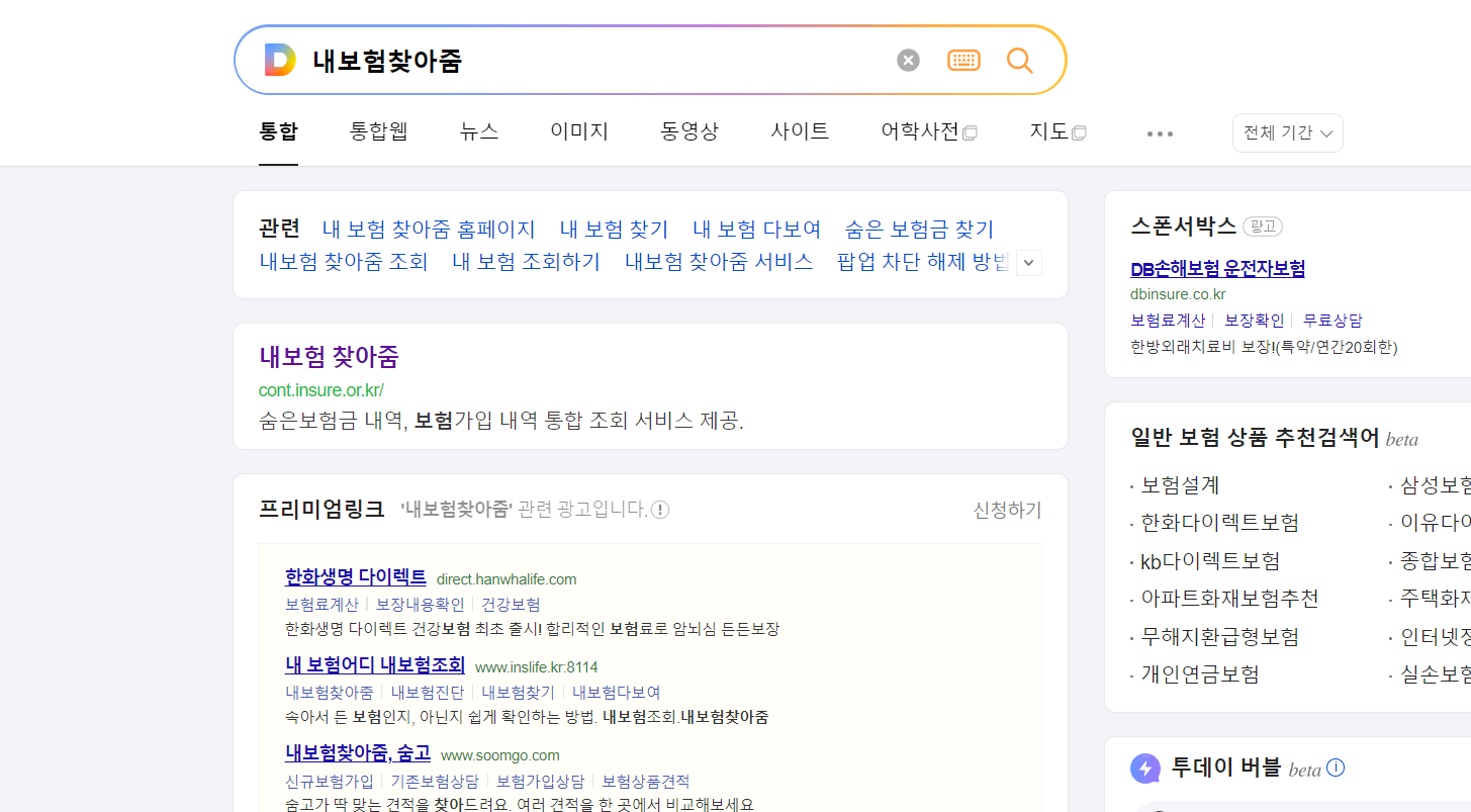 먼저 저는 '내 보험 찾아줌' 이라고 검색을 해봤어요.